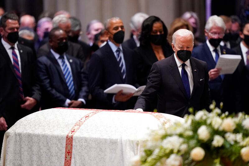 Madeleine Albright memorial President Joe Biden places his hand on the casket of former Secretary of State Madeleine Albright during the funeral service at the Washington National Cathedral, Wednesday, April 27, 2022, in Washington. (AP Photo/Evan Vucci) (Evan Vucci/AP)