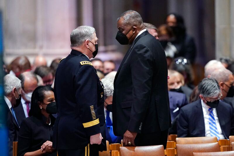 Remembering Madeleine Albright Chairman of the Joint Chiefs of Staff Gen. Mark Milley, left, talks to Secretary of Defense Lloyd Austin as they arrive for the funeral of former Secretary of State Madeleine Albright, at the Washington National Cathedral, Wednesday, April 27, 2022, in Washington. (AP Photo/Evan Vucci) (Evan Vucci/AP)