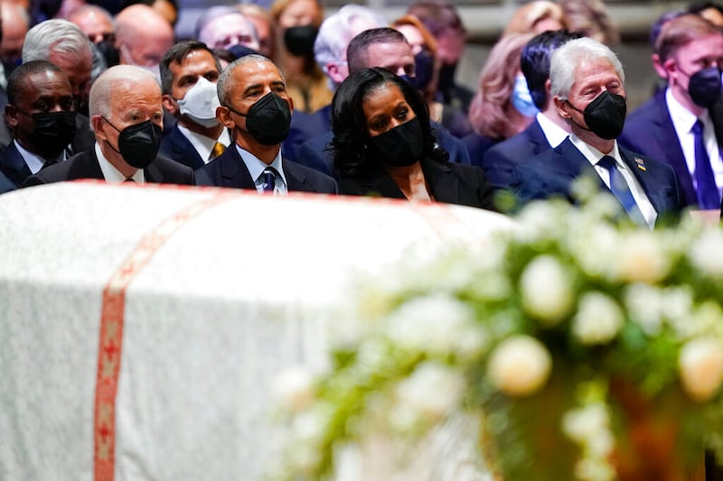 Madeleine Albright memorial President Joe Biden, left, former President Barack Obama, former first lady Michelle Obama and former President Bill Clinton attend the funeral service for former Secretary of State Madeleine Albright at the Washington National Cathedral, Wednesday, April 27, 2022, in Washington. (AP Photo/Andrew Harnik) (Andrew Harnik/AP)