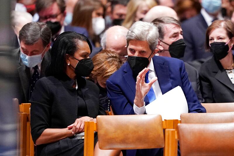 Remembering Madeleine Albright Former Secretaries of State Condoleeza Rice and John Kerry, talk as before the funeral of former Secretary of State Madeleine Albright, at the Washington National Cathedral, Wednesday, April 27, 2022, in Washington. (AP Photo/Evan Vucci) (Evan Vucci/AP)