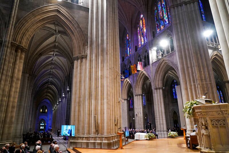 Madeleine Albright memorial service The casket of former Secretary of State Madeleine Albright is seen during the funeral service at the Washington National Cathedral, Wednesday, April 27, 2022, in Washington. (AP Photo/Andrew Harnik) (Andrew Harnik/AP)