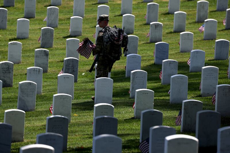 Arlington Cemetery flags ARLINGTON, VIRGINIA - MAY 27: A service member walsk through “Flags In” ceremony ahead of the Memorial Day weekend at Arlington National Cemetery on May 27, 2021 in Arlington, Virginia. For the first time in 20 years, members from all joint services worked to place flags at each of the 260,000 headstones in the cemetery. Arlington Cemetery recently announced they would be relaxing the visitor restrictions imposed at the beginning of the Coronavirus Pandemic, which has affected ceremonies and traditions over the last year. (Photo by Anna Moneymaker/Getty Images) (Anna Moneymaker/Getty Images)
