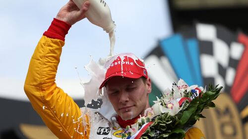2023 Indy 500: Josef Newgarden douses himself with the traditional bottle of milk after winning the Indianapolis 500 on Sunday. (James Gilbert/Getty Images)