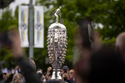 2023 Indy 500: The Borg-Warner Trophy is displayed before the 107th Running of the Indianapolis 500. (James Gilbert/Getty Images)