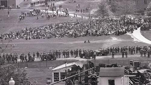 Kent State shootings: View, past the Kent State University Victory Bell (upon which is written "Strike", of a line of Ohio National Guardsman assembled on the Commons, Kent, Ohio, on May 4, 1970. (Howard Ruffner/Getty Images)