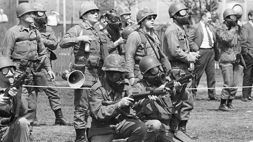 Kent State shootings: Ohio National Guardsmen on the Kent State University Commons as they prepare to disperse student protesters, Kent, Ohio, on May 4, 1970. (Howard Ruffner/Getty Images)