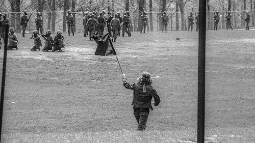 50th anniverasry of Kent State University shooting Kent State University student Alan Canfora waves a black flag as Ohio Army National Guardsmen kneel and aim their rifles. (Howard Ruffner/Getty Images )