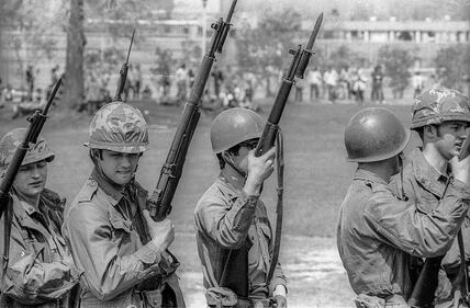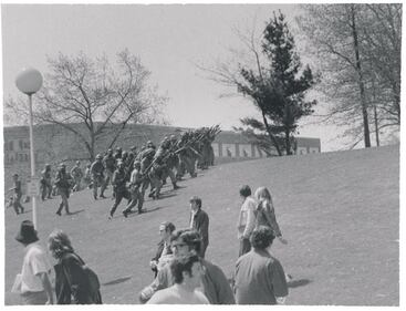 Kent State shootings: An Ohio National Guard skirmish line advances up a hill on the campus of Kent State University, on May 4, 1970. (Bettmann/Bettmann Archive)