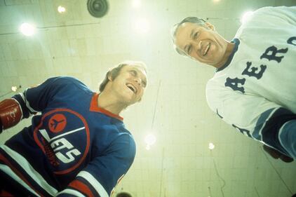 Through the years HOUSTON, TX - 1976: Bobby Hull #9 of the Winnipeg Jets and Gordie Howe #9 of the Houston Aeros faceoff over the camera during a photo shoot between the two legends before their game circa 1976 at the Summit in Houston, Texas. (Photo by Melchior DiGiacomo/Getty Images) (Melchior DiGiacomo/Getty Images)