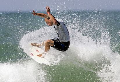 Chris Davidson through the years Australian surfer Chris Davidson goes for an aerial 22 August 2004 in Lacanau, western France, during the Nokia Lacanau Pacific Motion Pro, the first French Stage of the ASP surfing World Championships. Australian Bede Durbridge won the French event. AFP PHOTO PATRICK BERNARD (Photo by Patrick BERNARD / AFP) (Photo by PATRICK BERNARD/AFP via Getty Images) (PATRICK BERNARD/AFP via Getty Images)