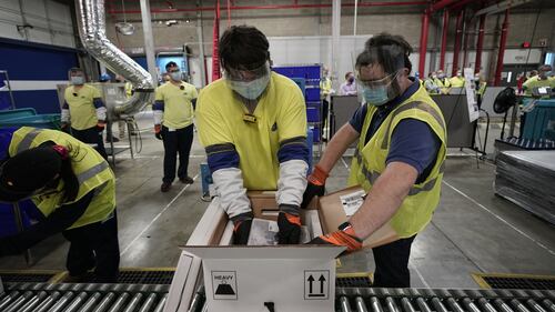 Photos: COVID-19 vaccine shipments begin in US amid coronavirus pandemic Workers pack boxes containing the Pfizer-BioNTech DOVID-19 vaccine as they are prepared to be shipped at the Pfizer Global Supply Kalamazoo manufacturing plant in Kalamazoo, Michigan, on December 13, 2020. (MORRY GASH/POOL/AFP via Getty Images)