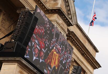 The State Funeral Of Queen Elizabeth II LONDON, ENGLAND - SEPTEMBER 19: Mourners gather outside Buckingham Palace during the State Funeral of Queen Elizabeth II at Westminster Abbey on September 19, 2022 in London, England. Elizabeth Alexandra Mary Windsor was born in Bruton Street, Mayfair, London on 21 April 1926. She married Prince Philip in 1947 and ascended the throne of the United Kingdom and Commonwealth on 6 February 1952 after the death of her Father, King George VI. Queen Elizabeth II died at Balmoral Castle in Scotland on September 8, 2022, and is succeeded by her eldest son, King Charles III. (Photo by Alkis Konstantinidis - WPA Pool/Getty Images) (WPA Pool/Getty Images)