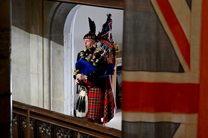 The State Funeral Of Queen Elizabeth II LONDON, ENGLAND - SEPTEMBER 19: Pipe Major Paul Burns of the Royal Regiment of Scotland helps to close Queen Elizabeth II state funeral with a rendition of the traditional piece Sleep, Dearie, Sleep at Westminster Abbey on September 19, 2022 in London, England. Elizabeth Alexandra Mary Windsor was born in Bruton Street, Mayfair, London on 21 April 1926. She married Prince Philip in 1947 and ascended the throne of the United Kingdom and Commonwealth on 6 February 1952 after the death of her Father, King George VI. Queen Elizabeth II died at Balmoral Castle in Scotland on September 8, 2022, and is succeeded by her eldest son, King Charles III. (Photo by Gareth Cattermole/Getty Images) (GARETH CATTERMOLE/Getty Images)