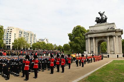 The Committal Service For Her Majesty Queen Elizabeth II WINDSOR, ENGLAND - SEPTEMBER 19: ,Members of the Coldstream guards and Gentlemen at Arms are seen during the State Funeral of Queen Elizabeth II at Wellington Arch on September 19, 2022 in London, England. Elizabeth Alexandra Mary Windsor was born in Bruton Street, Mayfair, London on 21 April 1926. She married Prince Philip in 1947 and ascended the throne of the United Kingdom and Commonwealth on 6 February 1952 after the death of her Father, King George VI. Queen Elizabeth II died at Balmoral Castle in Scotland on September 8, 2022, and is succeeded by her eldest son, King Charles III. (Photo by Leon Neal/Getty Images) (LEON NEAL/Getty Images)