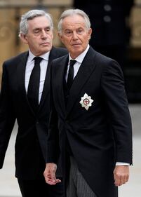 The State Funeral Of Queen Elizabeth II LONDON, ENGLAND - SEPTEMBER 19: Former Prime Ministers Gordon Brown and Tony Blair arrive at Westminster Abbey ahead of The State Funeral of Queen Elizabeth II on September 19, 2022 in London, England. Elizabeth Alexandra Mary Windsor was born in Bruton Street, Mayfair, London on 21 April 1926. She married Prince Philip in 1947 and ascended the throne of the United Kingdom and Commonwealth on 6 February 1952 after the death of her Father, King George VI. Queen Elizabeth II died at Balmoral Castle in Scotland on September 8, 2022, and is succeeded by her eldest son, King Charles III. (Photo by Christopher Furlong/Getty Images) (Chris Furlong/Getty Images)