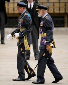 The State Funeral Of Queen Elizabeth II LONDON, ENGLAND - SEPTEMBER 19: King Charles III, and Princess Anne, Princess Royal salute as they take part in the state funeral and burial of Queen Elizabeth II at Westminster Abbey on September 19, 2022 in London, England. Members of the public are able to pay respects to Her Majesty Queen Elizabeth II for 23 hours a day from 17:00 on September 18, 2022 until 06:30 on September 19, 2022. Queen Elizabeth II died at Balmoral Castle in Scotland on September 8, 2022, and is succeeded by her eldest son, King Charles III. (Photo by Hannah McKay- WPA Pool/Getty Images) (WPA Pool/Getty Images)
