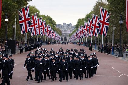 Photos: Crowds gather ahead of Queen Elizabeth II's state funeral Metropolitan police officers are seen walking in formation down The Mall ahead of the State Funeral of Queen Elizabeth II on September 19, 2022, in London. (Joe Maher/Getty Images)