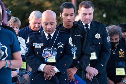 Photos: Fallen police officers honored at candlelight vigil in Washington, DC Survivors bow their heads in prayer during the National Law Enforcement Officers Memorial Fund's Annual Candlelight Vigil, on the National Mall, Thursday, Oct. 14, 2021, in Washington. (AP Photo/Alex Brandon)