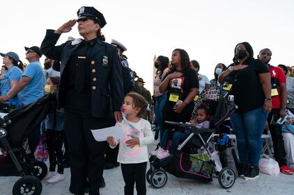Photos: Fallen police officers honored at candlelight vigil in Washington, DC Survivors stand during the playing of the National Anthem during the National Law Enforcement Officers Memorial Fund's Annual Candlelight Vigil, on the National Mall, Thursday, Oct. 14, 2021, in Washington. (AP Photo/Alex Brandon)