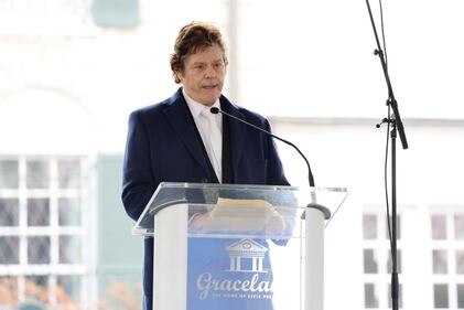 Lisa Marie Presley memorial service: Jerry Schilling, a member of Elvis Presley's "Memphis Mafia" during the 1960s and '70s, speaks at the public memorial for Lisa Marie Presley at Graceland. (Jason Kempin/Getty Images)