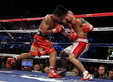 Photos: Manny Pacquiao through the years 2012: Manny Pacquiao and Juan Manuel Marquez exchange blows during their welterweight bout at the MGM Grand Garden Arena on December 8, 2012, in Las Vegas. (Al Bello/Getty Images)