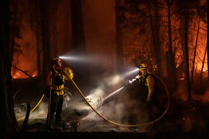 Photos: No containment, new threats from California's Caldor Fire Firefighters roll up a forestry hose during the Caldor Fire in Kyburz, California, U.S., on Sunday, Aug. 22, 2021. The fire, which has scorched 82,444 acres since sparking last week, crossed Highway 50 on Saturday with the help of increased wind activity. (David Odisho/Bloomberg via Getty Images)