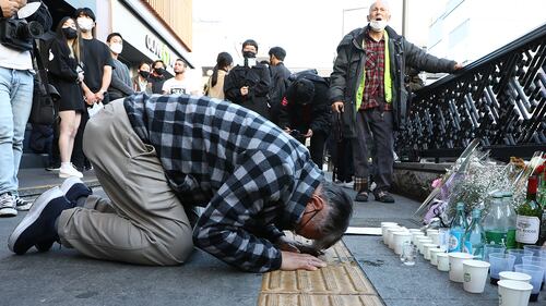 Photos: South Korean mourns, seeks answers in Halloween crowd deaths A man reacts as he pays tribute at memorial altar for the victims of the Halloween celebration stampede, in front of City Hall on October 31, 2022, in Seoul, South Korea. (Chung Sung-Jun/Getty Images)