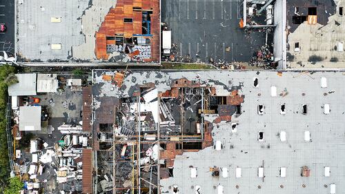 Tornado hits Los Angeles area, damaging buildings An aerial view of roof damage after a tornado touched down and ripped up building roofs in a Los Angeles suburb on March 22, 2023 in Montebello, California. Another Pacific storm has been pounding California with heavy rain, high winds, and snow. (Mario Tama/Getty Images)