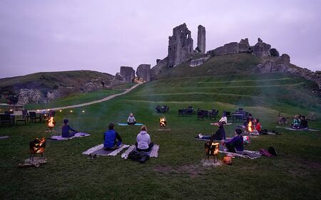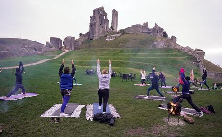 Winter Solstice 2021 People take part in a winter solstice yoga session at the National Trust's Corfe Castle in Dorset to mark the solstice and to witness the sunrise after the longest night of the year. Picture date: Tuesday December 21, 2021. (Photo by Andrew Matthews/PA Images via Getty Images) (Andrew Matthews - PA Images/PA Images via Getty Images)