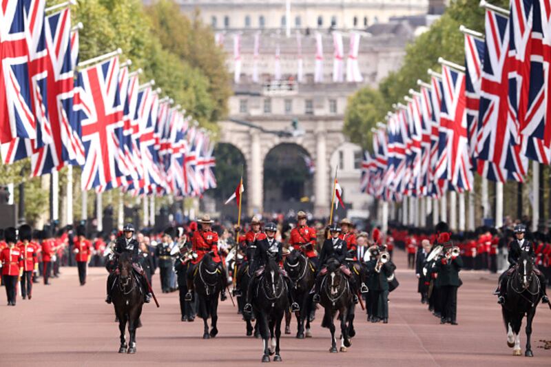 The State Funeral Of Queen Elizabeth II LONDON, ENGLAND - SEPTEMBER 19:Members of a military band pass through Whitehall ahead of the State Funeral of Queen Elizabeth II at Westminster Abbey on September 19, 2022 in London, England. Elizabeth Alexandra Mary Windsor was born in Bruton Street, Mayfair, London on 21 April 1926. She married Prince Philip in 1947 and ascended the throne of the United Kingdom and Commonwealth on 6 February 1952 after the death of her Father, King George VI. Queen Elizabeth II died at Balmoral Castle in Scotland on September 8, 2022, and is succeeded by her eldest son, King Charles III. (Photo by David Davies - WPA Pool/Getty Images) (David Davies/Getty Images)