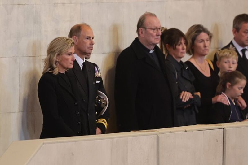 William, Harry, cousins stand vigil by Queen Elizabeth II's coffin LONDON, ENGLAND - SEPTEMBER 17: Sophie, Countess of Wessex and Prince Edward, Earl of Wessex arrive for a vigil in honour of Queen Elizabeth II at Westminster Hall on September 17, 2022 in London, England. Queen Elizabeth II's grandchildren mount a family vigil over her coffin lying in state in Westminster Hall. Queen Elizabeth II died at Balmoral Castle in Scotland on September 8, 2022, and is succeeded by her eldest son, King Charles III. (Photo by Chris Jackson/Getty Images) (CHRIS Jackson GETTY IMAGES/Getty Images)