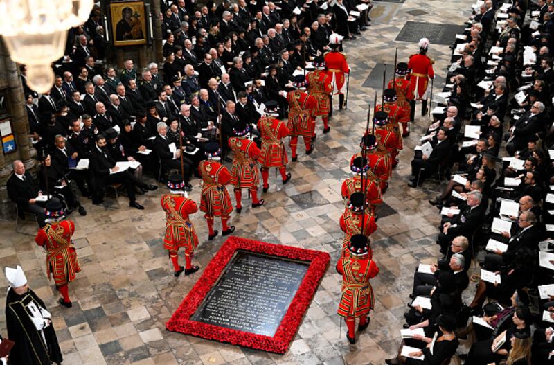 The State Funeral Of Queen Elizabeth II LONDON, ENGLAND - SEPTEMBER 19: The Yeoman of the Guard arrive in Westminster Abbey during The State Funeral of Queen Elizabeth II on September 19, 2022 in London, England. Elizabeth Alexandra Mary Windsor was born in Bruton Street, Mayfair, London on 21 April 1926. She married Prince Philip in 1947 and ascended the throne of the United Kingdom and Commonwealth on 6 February 1952 after the death of her Father, King George VI. Queen Elizabeth II died at Balmoral Castle in Scotland on September 8, 2022, and is succeeded by her eldest son, King Charles III. (Photo by Gareth Cattermole/Getty Images) (GARETH CATTERMOLE/Getty Images)