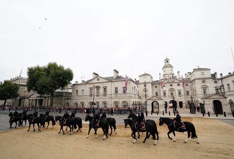 The Committal Service For Her Majesty Queen Elizabeth II WINDSOR, ENGLAND - SEPTEMBER 19: Dismounted detachment of the Household Cavalry are seen at Windsor Castle on September 19, 2022 in Windsor, England. The committal service at St George's Chapel, Windsor Castle, took place following the state funeral at Westminster Abbey. A private burial in The King George VI Memorial Chapel followed. Queen Elizabeth II died at Balmoral Castle in Scotland on September 8, 2022, and is succeeded by her eldest son, King Charles III. (Photo by Leon Neal/Getty Images) (LEON NEAL/Getty Images)