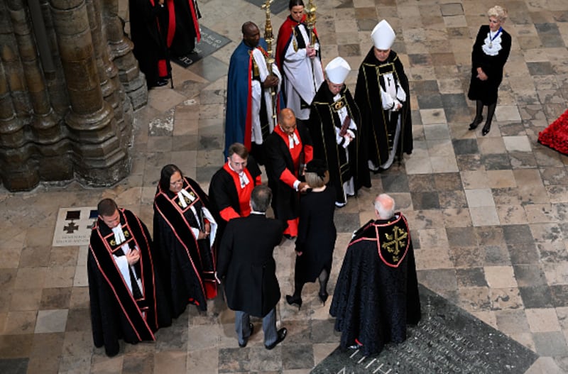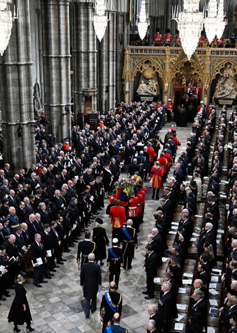 The State Funeral Of Queen Elizabeth II LONDON, ENGLAND - SEPTEMBER 19: Dignitaries arrive for the state funeral and burial of Queen Elizabeth II at Westminster Abbey on September 19, 2022 in London, England. Members of the public are able to pay respects to Her Majesty Queen Elizabeth II for 23 hours a day from 17:00 on September 18, 2022 until 06:30 on September 19, 2022. Queen Elizabeth II died at Balmoral Castle in Scotland on September 8, 2022, and is succeeded by her eldest son, King Charles III. (Photo by Danny Lawson - WPA Pool/Getty Images) (Danny Lawson/Getty Images)