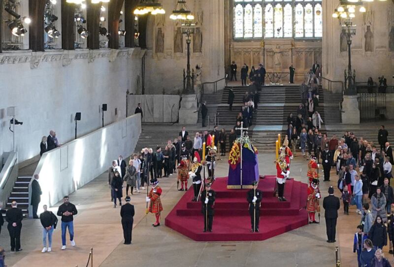 Photos: Crowds gather ahead of Queen Elizabeth II's state funeral LONDON, ENGLAND - SEPTEMBER 19: Guests and officials begin to take their places ahead of the state funeral and burial of Queen Elizabeth II at Westminster Abbey on September 19, 2022 in London, England. Members of the public are able to pay respects to Her Majesty Queen Elizabeth II for 23 hours a day from 17:00 on September 18, 2022 until 06:30 on September 19, 2022. Queen Elizabeth II died at Balmoral Castle in Scotland on September 8, 2022, and is succeeded by her eldest son, King Charles III. (Photo by Frank Augstein - WPA Pool/Getty Images) (Frank Augstein/Getty Images)