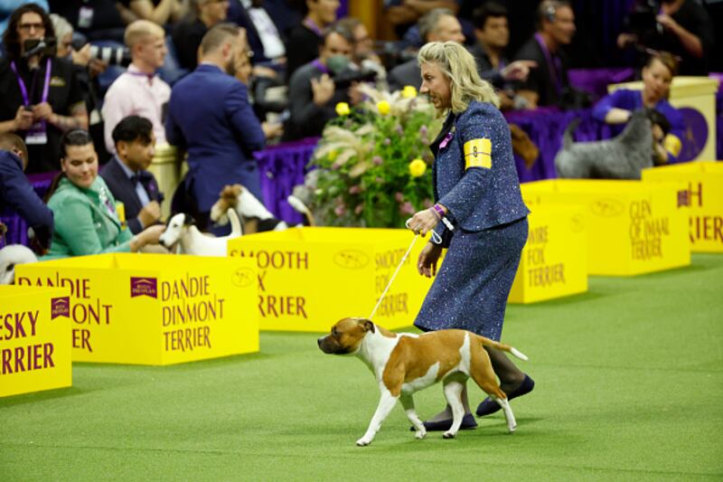 147th Annual Westminster Kennel Club Dog Show Presented by Purina Pro Plan NEW YORK, NEW YORK - MAY 09: Trouble, the American Staffordshire Terrier, winner of the Terrier Group, competes for Best in Show at the 147th Annual Westminster Kennel Club Dog Show Presented by Purina Pro Plan at Arthur Ashe Stadium on May 09, 2023 in New York City. (Photo by Sarah Stier/Getty Images for Westminster Kennel Club) (Sarah Stier/Getty Images for Westminster Ken)