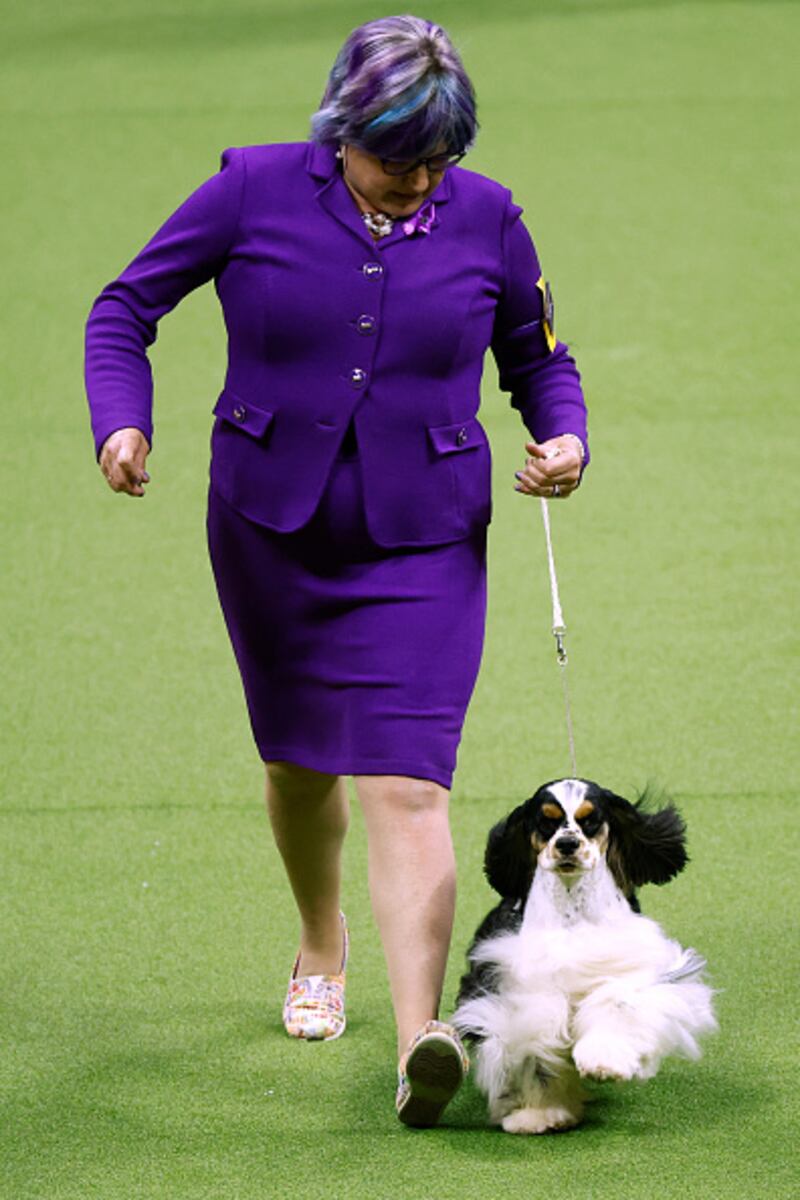 147th Annual Westminster Kennel Club Dog Show Presented by Purina Pro Plan NEW YORK, NEW YORK - MAY 09: A Parti-Color Cocker Spaniel competes at the 147th Annual Westminster Kennel Club Dog Show Presented by Purina Pro Plan at Arthur Ashe Stadium on May 09, 2023 in New York City. (Photo by Sarah Stier/Getty Images for Westminster Kennel Club) (Sarah Stier/Getty Images for Westminster Ken)