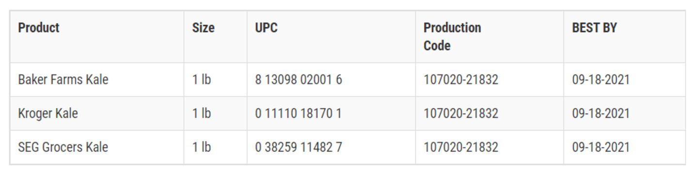 The following products are part of the recall: Baker Farms Kale, Kroger Kale and SEG Grocers Kale. See the chart below for production codes and best by dates impacted by the recall.