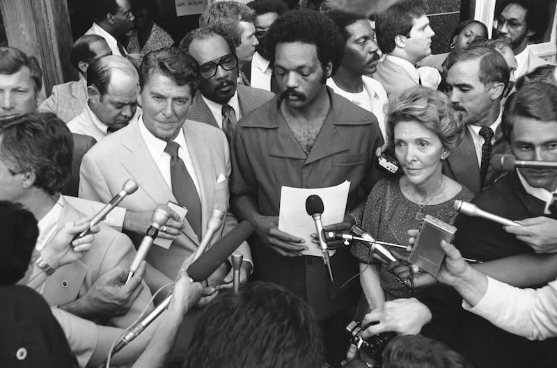 Photos: Jesse Jackson through the years 1980: Republican presidential nominee Gov. Ronald Reagan talks with the Rev. Jesse L. Jackson, director of Operation Push, outside the organization's headquarters in Chicago on Tuesday, August 5, 1980. Nancy Reagan is at right. (AP Photo/Fred Jewell)