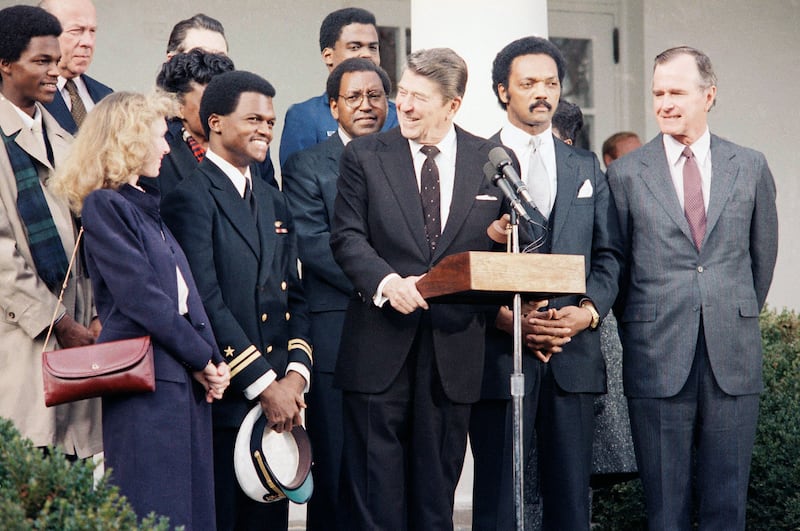 Photos: Jesse Jackson through the years 1984: Lt. Robert O. Goodman Jr., second from left, is welcomed home by President Ronald Reagan during a Rose Garden ceremony outside the White House, Jan. 4, 1984, after he was returned from Syrian captivity. Looking on from left: wife Terry Lynn; Goodman's brother Martin; Secretary of State George Shultz; Goodman's mother Marilyn (partially obscured); his father Robert Sr.; his brother Tyron (partially obscured); Reagan; the Rev. Jesse Jackson, who was instrumental in negotiating his release; Vice President George Bush. (AP Photo/Ira Schwarz)