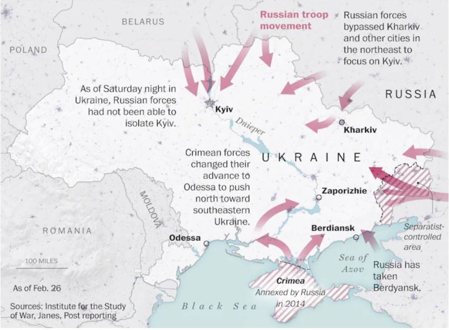 Update 7:35 p.m. EST Feb. 26: By 7:30 p.m. EST Saturday, Russian troops had moved into Ukraine from the north, south and east. Unanticipated resistance in Kyiv, however, has thwarted Russia’s advances from the south, The Washington Post reported, providing the map below: