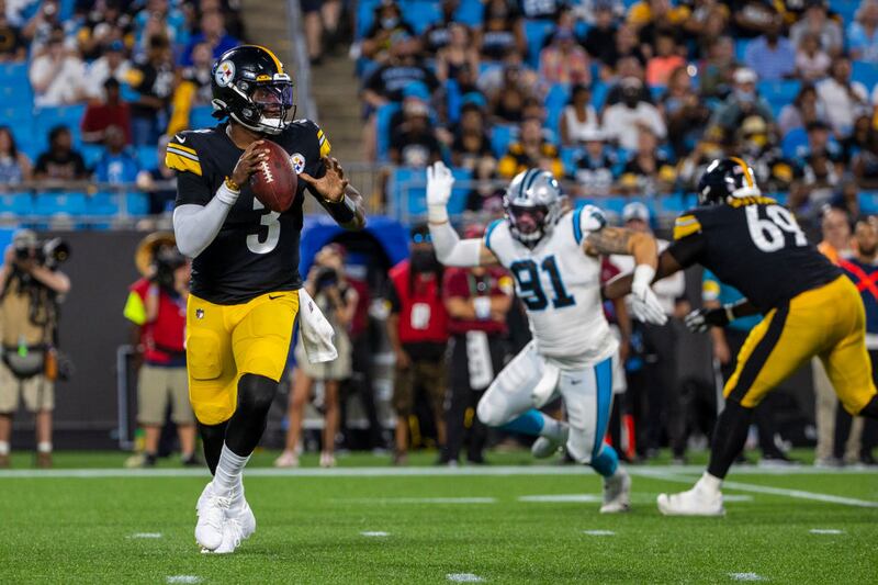 Pittsburgh Steelers v Carolina Panthers CHARLOTTE, NC - AUGUST 27: Dwayne Haskins #3 of the Pittsburgh Steelers scrambles out of the pocket against the Carolina Panthers during the first half of an NFL preseason game at Bank of America Stadium on August 27, 2021 in Charlotte, North Carolina. (Photo by Chris Keane/Getty Images) (Chris Keane/Getty Images)