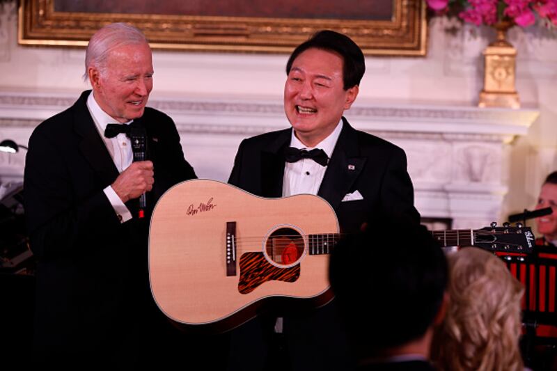 State dinner WASHINGTON, DC - APRIL 26: U.S. President Joe Biden presents South Korean President Yoon Suk-yeol with a guitar signed by singer/songwriter Don McLean during a state dinner at the White House, April 26, 2023 in Washington, DC. President Joe Biden and first lady Jill Biden are hosting South Korean President Yoon Suk-yeol and South Korean first lady Kim Keon-hee for a State Dinner. (Photo by Chip Somodevilla/Getty Images) (Chip Somodevilla/Getty Images)