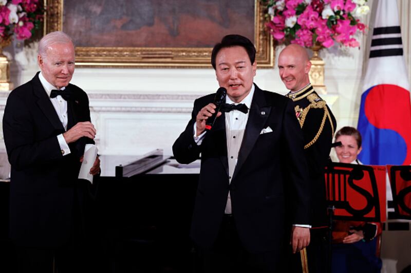 State dinner WASHINGTON, DC - APRIL 26: At the behest of U.S. President Joe Biden (L), South Korean President Yoon Suk-yeol sings "American Pie" during a state dinner in the State Dining Room at the White House, April 26, 2023 in Washington, DC. President Joe Biden and first lady Jill Biden are hosting South Korean President Yoon Suk-yeol and South Korean first lady Kim Keon-hee for a State Dinner. (Photo by Chip Somodevilla/Getty Images) (Chip Somodevilla/Getty Images)