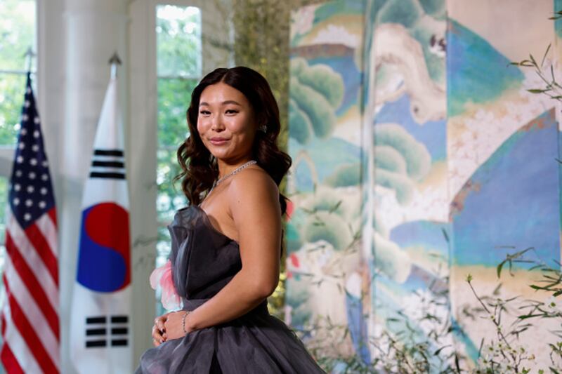 State dinner WASHINGTON, DC - APRIL 26: Olympic gold medalist Chloe Kim arrives for the White House state dinner for South Korean President Yoon Suk-yeol at the White House on April 26, 2023 in Washington, DC. President Joe Biden and first lady Jill Biden are hosting South Korean President Yoon Suk-yeol and South Korean first lady Kim Keon-hee for a State Dinner. (Photo by Anna Moneymaker/Getty Images) (Anna Moneymaker/Getty Images)
