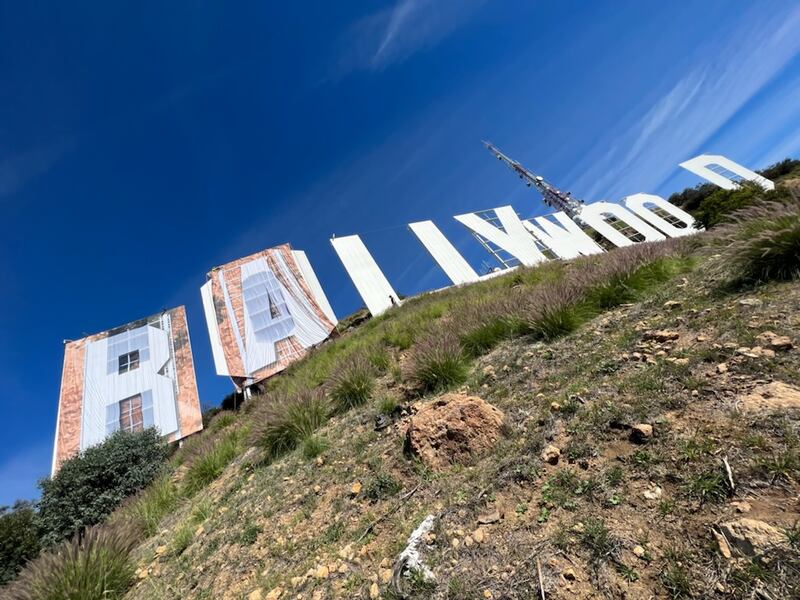 Hollywood Sign changes to Rams House Workers change the iconic Hollywood sign to read "Rams House" in honor of the Los Angeles Rams' Super Bowl Win. (Courtesy of the Hollywood Sign Trust and Photographer David Livingston/Courtesy of the Hollywood Sign Trust and Photographer David Livingston)