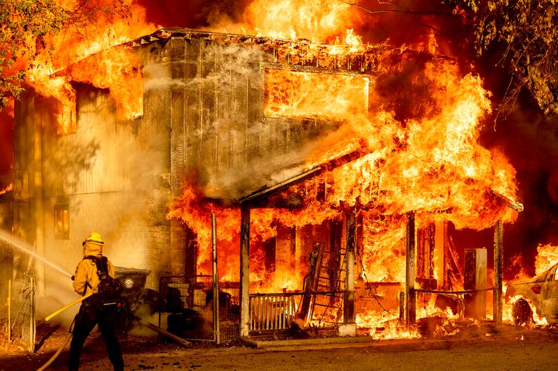 Beckwourth Complex Fire A firefighter sprays water while trying to stop the Sugar Fire, part of the Beckwourth Complex Fire, from spreading to neighboring homes in Doyle, Calif., Saturday, July 10, 2021. Pushed by heavy winds amid a heat wave, the fire came out of the hills and destroyed multiple residences in central Doyle. (AP Photo/Noah Berger) (Noah Berger/AP)