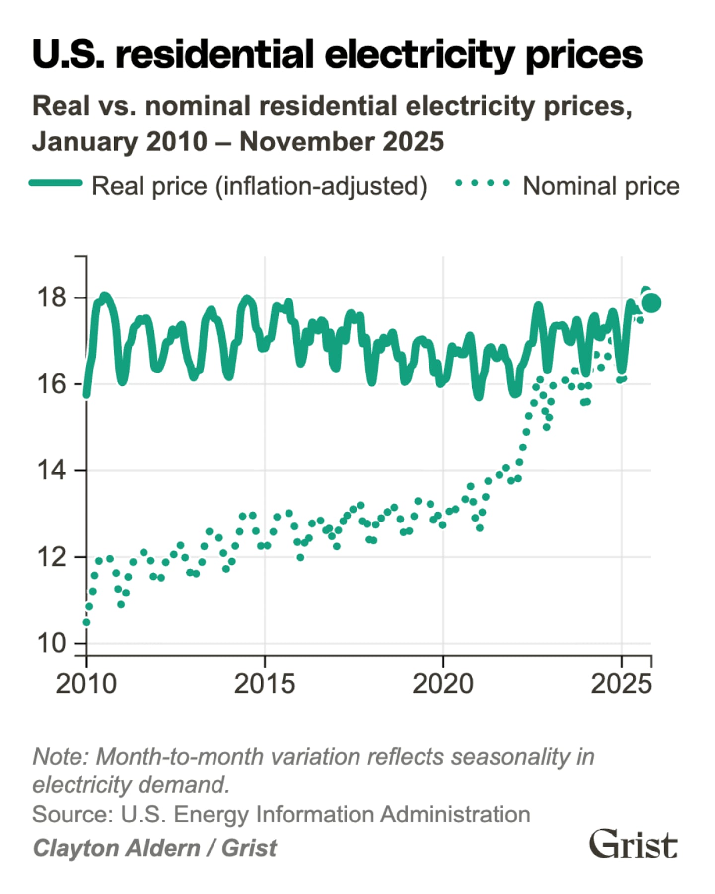 It's no secret that U.S. electricity prices have been rising over the last few years: The average residential energy bill in 2025 was roughly 30% higher than in 2021. This jump is largely in line with the overall inflation Americans have experienced during this period. As the cost of groceries, gas, and housing has increased, so too has the cost of electricity, Grist reports.