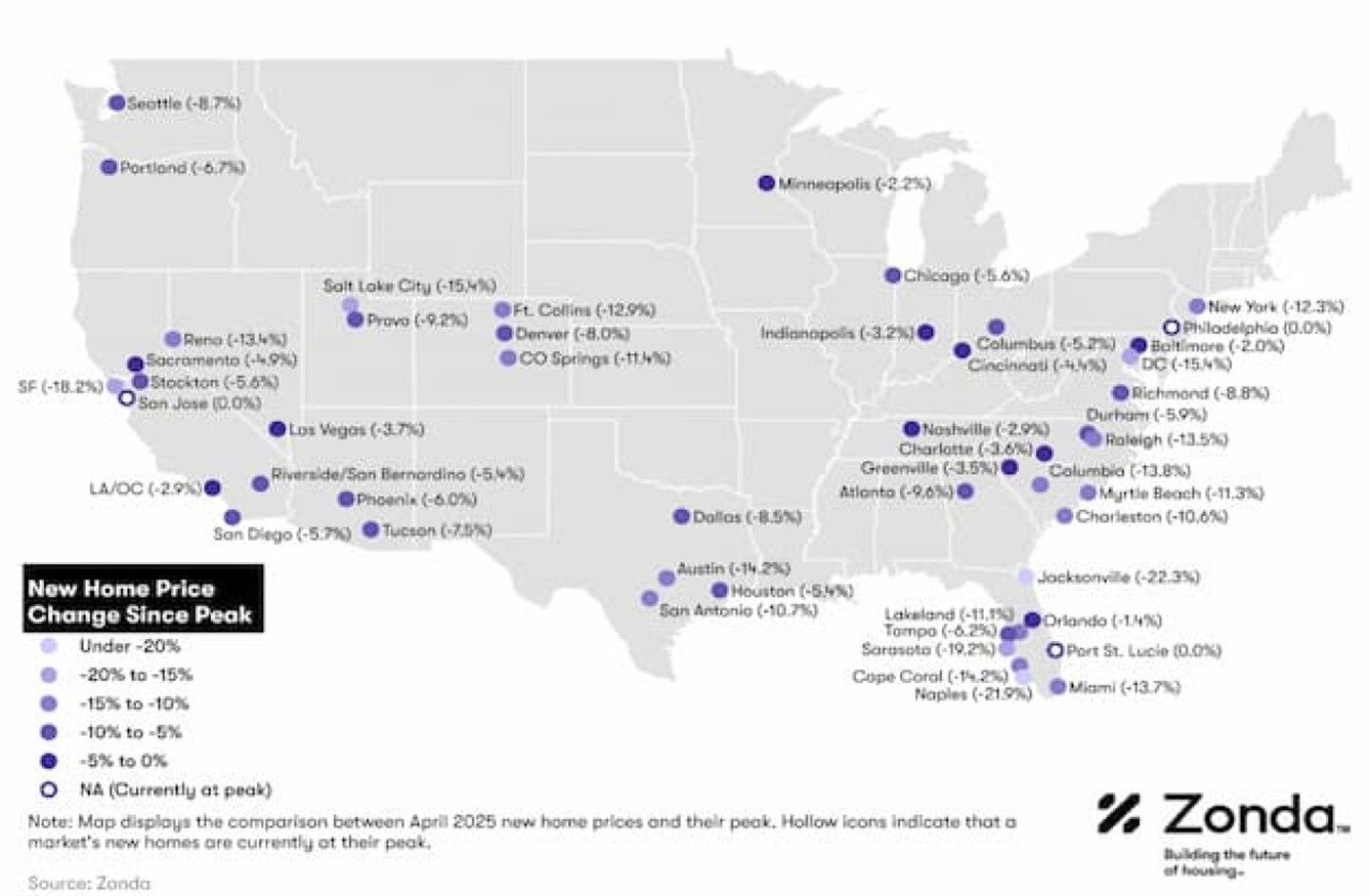 According to April 2025 data from Zonda, several markets have seen prices fall considerably from their recent peaks, opening the door for: