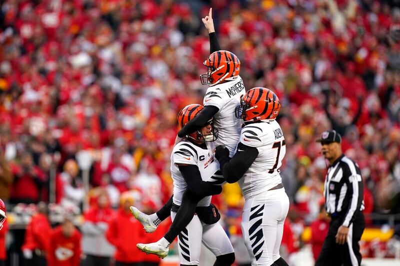 Chiefs-Bengals Cincinnati Bengals kicker Evan McPherson (2) celebrates with teammates after kicking a 31-yard field goal during overtime in the AFC championship NFL football game against the Kansas City Chiefs, Sunday, Jan. 30, 2022, in Kansas City, Mo. The Bengals won 27-24. (AP Photo/Eric Gay) (Eric Gay/AP)